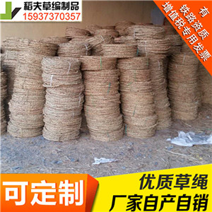 草绳又叫稻草绳是一种以稻草秸秆为原料经过专用的草绳机加工而成的草制品。草绳以廉价及对环境无污染的优势,在市场中一些行业中有着不可代替的地位,其主要应用于园林绿化业中对树木的保护;对管道工程施工时对管道的一些保护及对一些企业产品的外在的保护。因为草绳是以水稻秸秆为原料,水稻秸秆本身就有很好的减震性,所以经过加工后的草绳在缠绕到物品上之后就有更好的保护性。 草绳的制作简单,实用用途广泛,而且在园林绿化中也有着非常重要的作用,是现在园林中最长使用到的保护产品之一。草绳是由稻草加工而成,价格低廉,对环境无污染,是一种属于绿色环保的农业加工产品。草绳的用途很广主要用于:瓷器厂,砖瓦厂,预制件机械厂,园林公司,建筑工地等。由于草绳的用途越来越广,市场中对草绳的需求也不断的扩大,现在已经成了农民一项创收的主要途径。