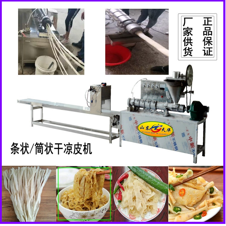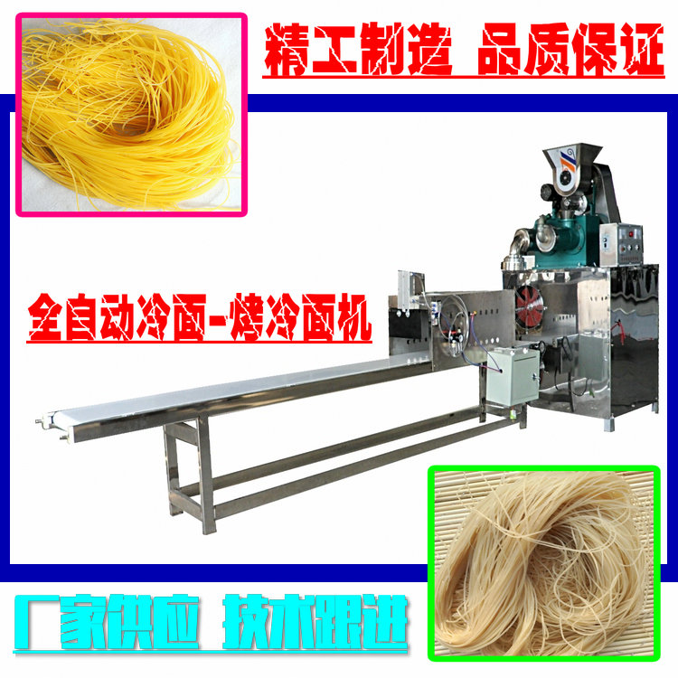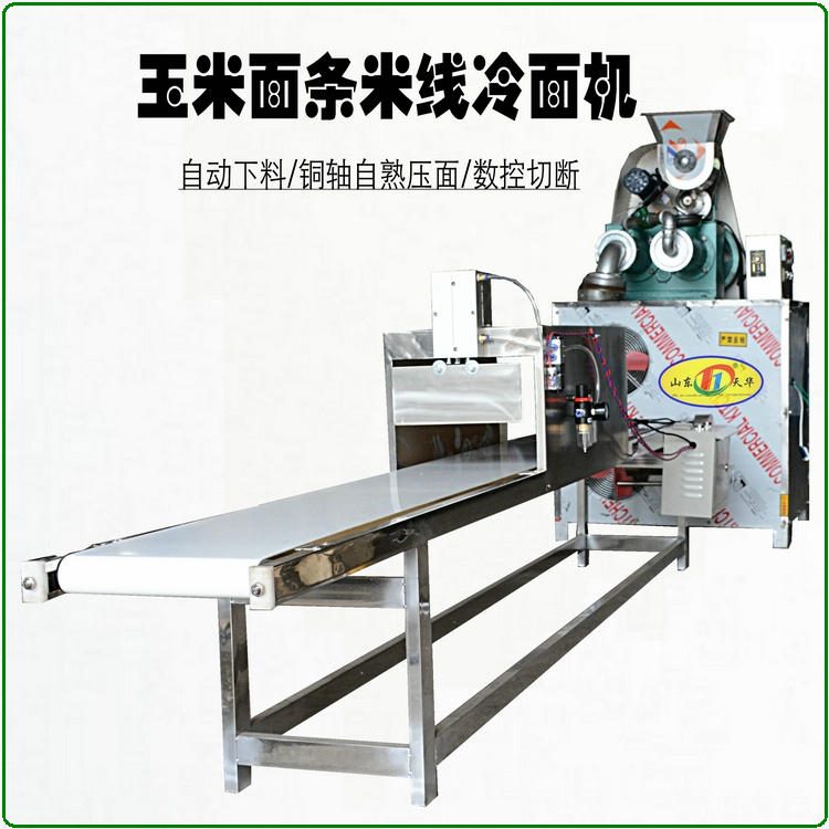 天华自熟冷面机(牛筋面机)结构合理,造型美观,由自动下料器、双铜轴压面机、数控切断机组成,自动下料器由调速电机带动,通过快慢速度调整喂料的多少,压面机采用螺旋挤压生物变性工艺,无需外加热源,利用轴筒旋转与原料摩擦揉挤产生的热能,使原料到成品一次熟化成型,将玉米面、荞麦面、小麦面等杂粮面通过冷面机综合转化成具有柔韧弹性特点的风味面食,更换不同的的模具可以加工不同粗细宽窄的形状,产品外表光滑、柔软可口、久煮不糊,保留原粮的特有营养成分和微量元素。自熟冷面机还可生产钢丝面、牛筋面及各种杂粮面条等。成型的面食进入调速皮带输送机,由延时控制切断装置把面条切成所需的长短后即可包装销售。