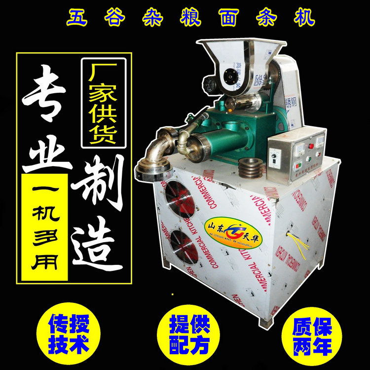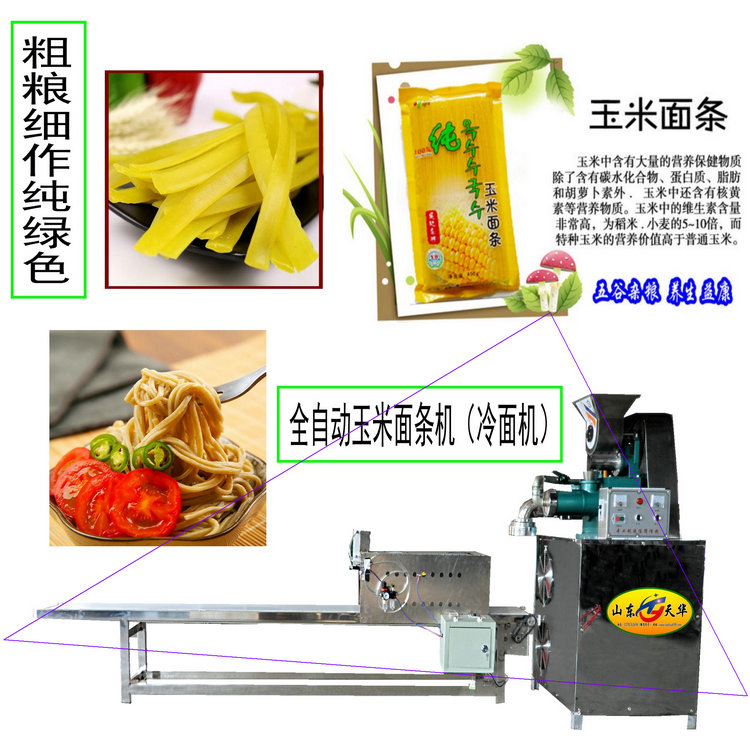 玉米富含多种营养成分,脱皮磨粉后加工的玉米面条有长寿面、黄金面之称,长期食用可增强肌体抵抗力,玉米面条迎合了现代人追求科学膳食,粗粮、杂粮、粗细搭配的饮食时尚,在我国城乡市场非常畅销。天华机械公司根据玉米等杂粮的特性,研制生产的多功能玉米面条机(烤冷面机),使纯玉米及各种杂粮加工面条成为现实,扩大了粗粮加工种类,创造了市场先机。
