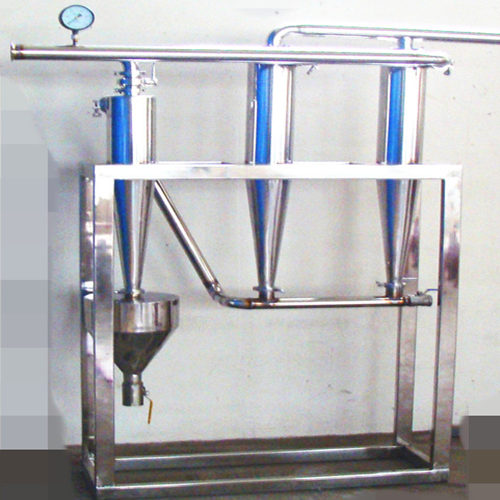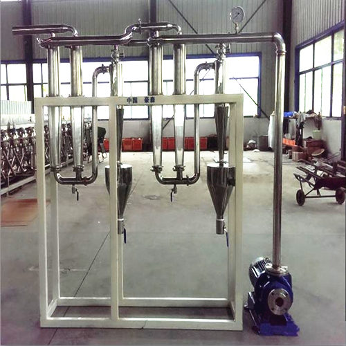 淀粉除砂器可以把经筛分机组加工后的淀粉乳液中的砂粒和其它较重杂质去除,是淀粉加工业必不可少的设备之一,也可适用于除去其它流体中的重质杂质。该设备结构简单,设计先进,用料讲究,锥形旋流管由卫生级镜面不锈钢板材制造,经久耐用,高速分离,除砂除杂率高,是豪森食品机械的独到之处。其工作时,乳液(淀粉乳)被泵入旋流除砂器内,并在除砂器内高速旋转,由于离心力的作用,较轻的物料(淀粉)通过溢流管排出,较重的物料(砂粒等)在离心力的作用下,沿着圆锥形的旋流管内壁向下从底部排出。向下旋流的砂粒收集于集砂斗内,由手工或自动的排砂阀排出。