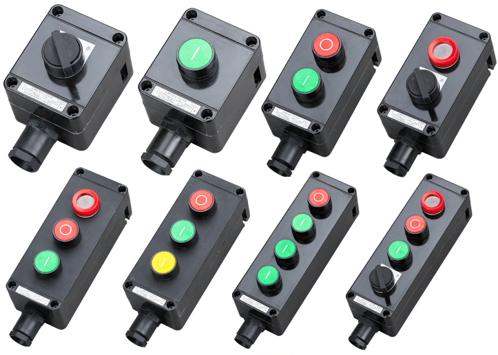 隔爆型控制开关具有结构紧凑,可靠性好,体积小,通断能力强,寿命长并有多种功能供用户选配。防爆按钮采用超声波封装工艺,保证了可靠的结合强度,按钮的功能可以两单元自由给合,防爆指示灯采用特殊设计,交流220-380V通用。