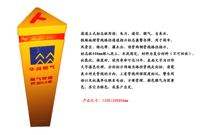 复合材料标志桩,警示牌,标志砖。广泛应用于电力、天然气、供水、通信、污水、石油、石化、矿山等管线地埋隐蔽工程。1、材料:高强度玻璃纤维复合材料模压制作(回收无用)。2、复合材料标志桩产品表面文字用特种丝印及凹型处理,一次着色固化成型。3、复合材料标志桩颜色艳丽、抗老化、强度好,使用寿命可达35年以上。4、复合材料标志桩真正免维护,不同于水泥、石头等材料需要定时每年去上油漆、喷字,省却维护工时费用,产品表面文字基础坚硬,耐磨持久。也可按用户单位提供的桩号,里程数,路径方向指示箭头,维护电话等信息资料逐个定做。5、复合材料标志桩安装方法:挖掘所埋深度坑,前后左右十字交叉穿入两根25 CM钢筋,水泥石子固定即可。圆形路面砖采用圆形开孔器按所需大小管道穿越路面打孔,下部用水泥浓浆固定,上口与路面齐平即可。6、复合材料标志桩全方位工程给甲方单位提升企业标准化管理新形象,具体尺寸可按要求定制。7、复合材料标志桩相关技术数据: 1、拉伸强度≥160MPa 2、弯曲强度≥190MPa 3、浸水后弯曲强度≥150MPa 4、巴氏硬度≥38 5、环钢度(5%)≥50KPa 6、热变形温度≥160℃ 7、氧指数26%需要产品请联系我 0311-80807169 15383713103 许女士