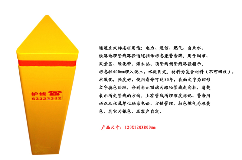 复合材料标志桩,警示牌,标志砖。广泛应用于电力、天然气、供水、通信、污水、石油、石化、矿山等管线地埋隐蔽工程。1、材料:高强度玻璃纤维复合材料模压制作(回收无用)。2、复合材料标志桩产品表面文字用特种丝印及凹型处理,一次着色固化成型。3、复合材料标志桩颜色艳丽、抗老化、强度好,使用寿命可达35年以上。4、复合材料标志桩真正免维护,不同于水泥、石头等材料需要定时每年去上油漆、喷字,省却维护工时费用,产品表面文字基础坚硬,耐磨持久。也可按用户单位提供的桩号,里程数,路径方向指示箭头,维护电话等信息资料逐个定做。5、复合材料标志桩安装方法:挖掘所埋深度坑,前后左右十字交叉穿入两根25 CM钢筋,水泥石子固定即可。圆形路面砖采用圆形开孔器按所需大小管道穿越路面打孔,下部用水泥浓浆固定,上口与路面齐平即可。6、复合材料标志桩全方位工程给甲方单位提升企业标准化管理新形象,具体尺寸可按要求定制。7、复合材料标志桩相关技术数据: 1、拉伸强度≥160MPa 2、弯曲强度≥190MPa 3、浸水后弯曲强度≥150MPa 4、巴氏硬度≥38 5、环钢度(5%)≥50KPa 6、热变形温度≥160℃ 7、氧指数26%需要产品请联系我 0311-80807169 15383713103 许女士