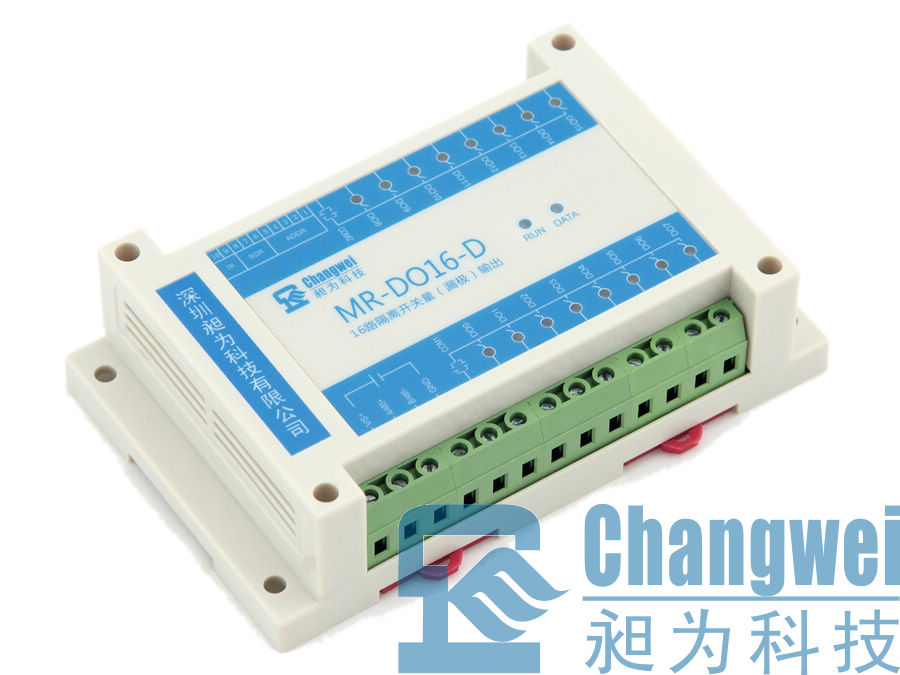 MR-DO16-D为RS485型隔离16通道开关量输出(DO)信号控制设备,2组相互隔离的开关量(漏极)输出通道,触点容量为100mA/30VDC,可实现小功率负载共电源负极的远程控制。