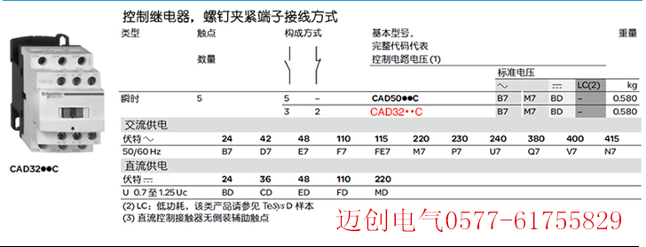 CAD-50●●C施耐德继电器CAD-32●●C多少钱、最低价、代理价格、什么价位、批发价格、最新价格、参考价格、价格查询、最实惠、透明价格、最低折扣、零售价格、批发零售价格、零售最低价格、优质价廉、质量、质量保证、价格功能特点、工作原理、出厂价格、接线说明、参考价格咨询热线:0577-61755829 唐经理:13867770469 QQ:82341566 CAD系列控制继电器安装尺寸与TeSys系列接触器LC1D09●●C一致,以下是完整型号:CAD-50●●C,触点5常开CAD-32●●C,触点3常开2常闭