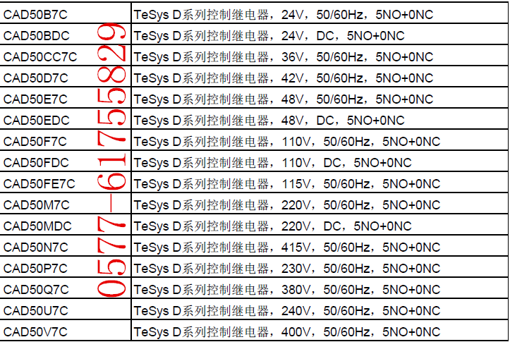 以下是施耐德CAD接触器式控制继电器系列部分型号:CAD32B7C,CAD32F7C,CAD32FE7C,CAD32M7C,CAD32N7C,CAD32P7C,CAD32Q7C,CAD32U7CCAD32V7C,CAD326F7C,CAD326M7C,CAD32M7CTQ,CAD50B7C,CAD50CC7C,CAD50D7C,CAD50E7C,CAD50F7C,CAD50FE7C,CAD50M7C,CAD50N7C,CAD50P7C,CAD50Q7C,CAD50U7C,CAD50V7C,CAD506F7C,CAD506M7C,CAD32BDC,CAD32EDC,CAD32FDC,,CAD32MDC,CAD50BDC,CAD326BDC,CAD50EDC,CAD50FDC,CAD50MDC,CAD506BDC,CAD32BL,CAD50BL,CAD32M7,CAD50M7,CAD32BD,CAD32FD,CAD32MD,CAD50BD,CAD50FD,CAD50MD,CAD32E7C,CAD-50B7C AC24V,CAD-50M7C AC220V,CAD-50BDC DC24V,CAD-32B7C AC24V,CAD-32M7C AC220V,CAD-32BDC DC24V,CAD-506B7C AC24V,CAD-506M7C AC220V,CAD-506BDC DC24V,CAD-326B7C AC24V,CAD-326M7C AC220V,CAD-326BDC DC24V,