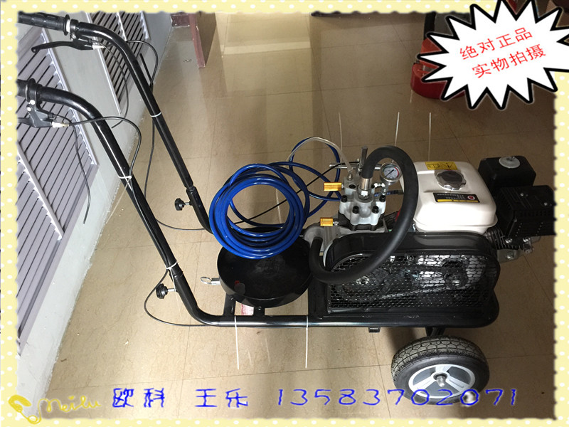 马路划线机是高压力等流量型无气喷涂划线机。道路划线机利用汽油机驱动大流量隔膜泵,使涂料在泵内形成高压,被增压的涂料,经高压软管输送至无气喷枪,最后在无气喷嘴处释放液压、瞬时雾化后喷向地面,形成标线涂膜层。配置单、双枪,可一次性完成斑马线等特殊标线。