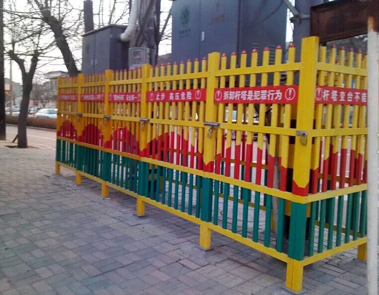 装设安全围栏是保证现场工作人员安全技术措施之一,主要用于发电厂,变电站的电气设备检修、电气实验、配电检修等。整套围栏由玻璃钢围栏片、支撑杆和支座组成。结构特点是玻璃钢为绝缘材料,且耐老化,经过防水处理后可增强其防潮性,保证玻璃钢安全围栏的绝缘性,该安全围栏红白相间,色彩鲜明,经久耐用。支撑杆用坚硬质轻的玻璃钢管制成,上面配有挂钩,可以牢固固定玻璃钢安全围栏片,使之不被掀起脱离。