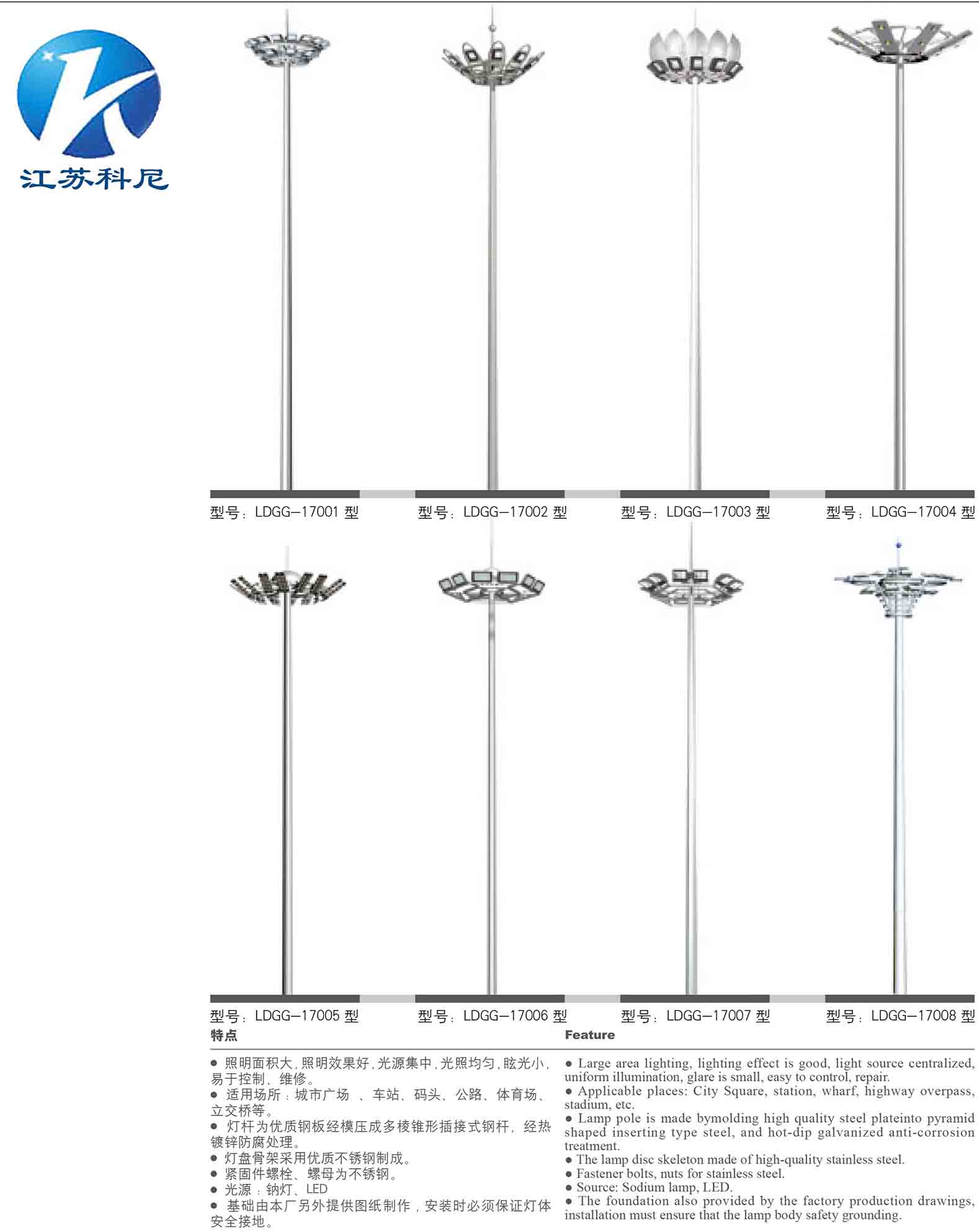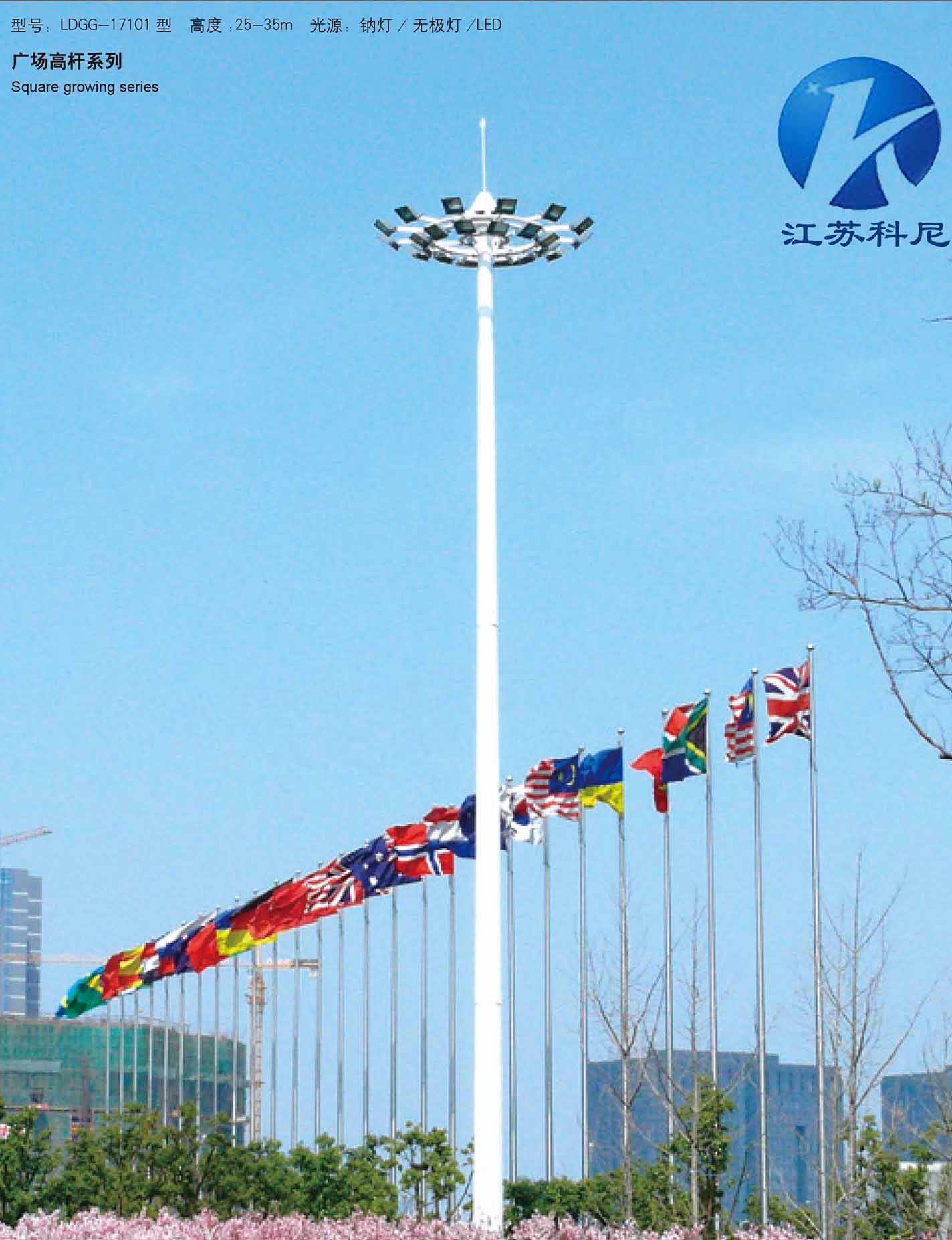 高杆灯:一般指15米以上钢制柱型灯杆和大功率组合式灯架构成的新型照明装置。它由灯头、内部灯具电气、杆体及基础部分组成。灯头造型可根据用户要求、周围环境、照明需要具体而定;内部灯具多由泛光灯和投光灯组成,光源采用NG400高压钠灯,照明半径达60米。杆体一般为圆柱型独体结构,用钢板卷制而成, 杆采用多边形(通常为8边/12边/16边)拔销杆,插接式结构 适用场所:机场、码头、车站、停车场、公路环岛、高速立交桥、体育场等。