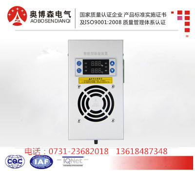 当潮湿空气经风扇吸入后,通过特殊设计的风道流动,先经半导体制冷器降温结露,制冷器的结露在重力作用下滴入引水槽,再由导水管流出柜外。在设定启动值内经过充分循环除湿,使柜内空气湿度降至结露点以下,完成整个防潮引凝加热过程。同时,智能型除湿装置信号采集传感器外置,能实时准确的采集到柜内的真实湿度,保证智能型除湿装置在柜内将要达到凝露条件时提前启动除湿。