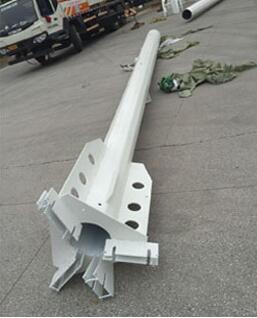 1.灯杆通常为八棱、十二棱锥形杆体,由高强度优质Q235钢板经剪制、折弯、自动焊接成形,一般高度有2 5米、3 0米、3 5米、40米等规格,设计最大抗风能力可达6 0米/秒,每种规格由2至4节插接组成,配法兰钢底盘,直径0.75米至1.2米,厚20mm至40mm。