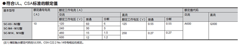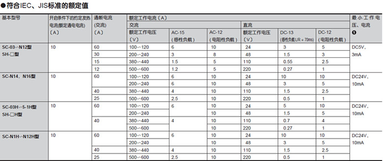 新型SC、NEO SC系列电磁接触器在标准产品铭牌上双重显示了JIS、JEM、IEC、EN、VDE标准的选用容量。在各国标准中,对于电动机额定功率[kW]的额定工作电流[A]比日本国内标准要低,因此有可能要提高选用容量。在选择符合IEC、EN、VDE标准的电磁接触器时,请按照说明书进行选择。