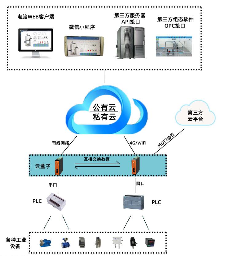 在设备控制的现场,物联网云盒子数据处理单元完成控制器与数据中心的远程通信,为客户提供远程维护的通道,便于用户远程监控、远程调试、远程维护以及建设大规模远程管理设备的信息化网络,同时可以为设备制造商、系统集成商以及终端客户提供完整的设备远程维护管理解决方案。