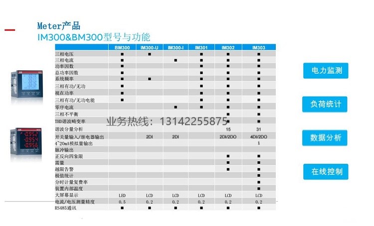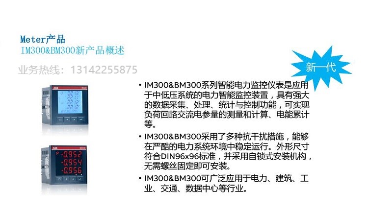 1、 IM300&BM300系列智能电力监控仪表是应用于中低压系统的电力智能监控装置,具有强大的数据采集、处理、统计与控制功能,可实现负荷回路交流电参量的测量和计算、电能累计等。