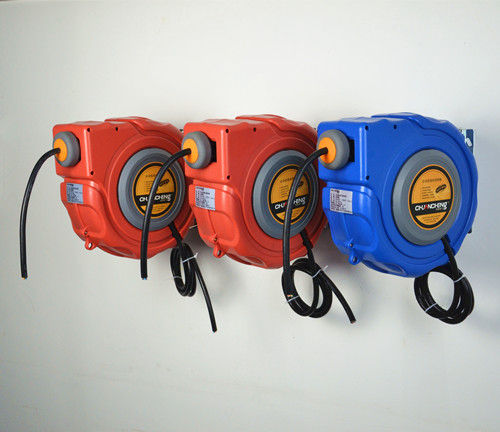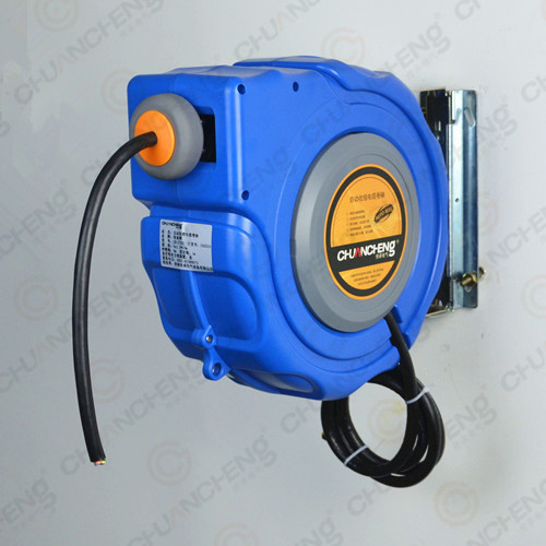 自动卷轴工作原理:输入端外接电源线,一般为插头部分;输出端电源线,可来回伸缩。电缆自动伸缩卷轴内有自锁装置,有自动排线功能,拉出电缆线一段后,自锁装置起作用(电源线停止不动),如想电缆线缩回,需再向外拉出一段电缆线,电缆迈过自锁装置松开电缆线,电缆线自动缩回。卷轴固定后可水平180度摆动。电缆伸缩自由,方便实用,有效地保证车间整齐美观,避免车间混乱不堪,消除不安全隐患。