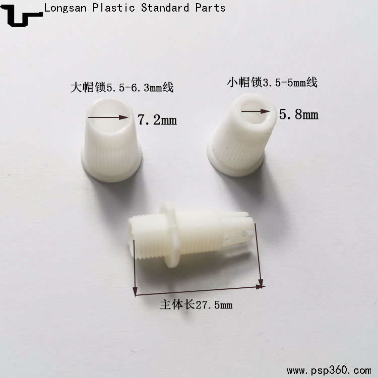 锁线范围:大帽直径7.2mm。可锁5-6.3mm的线材,小帽直径5.8mm,可锁3.5-5mm的线材。可以根据客人电源线的直径配货!