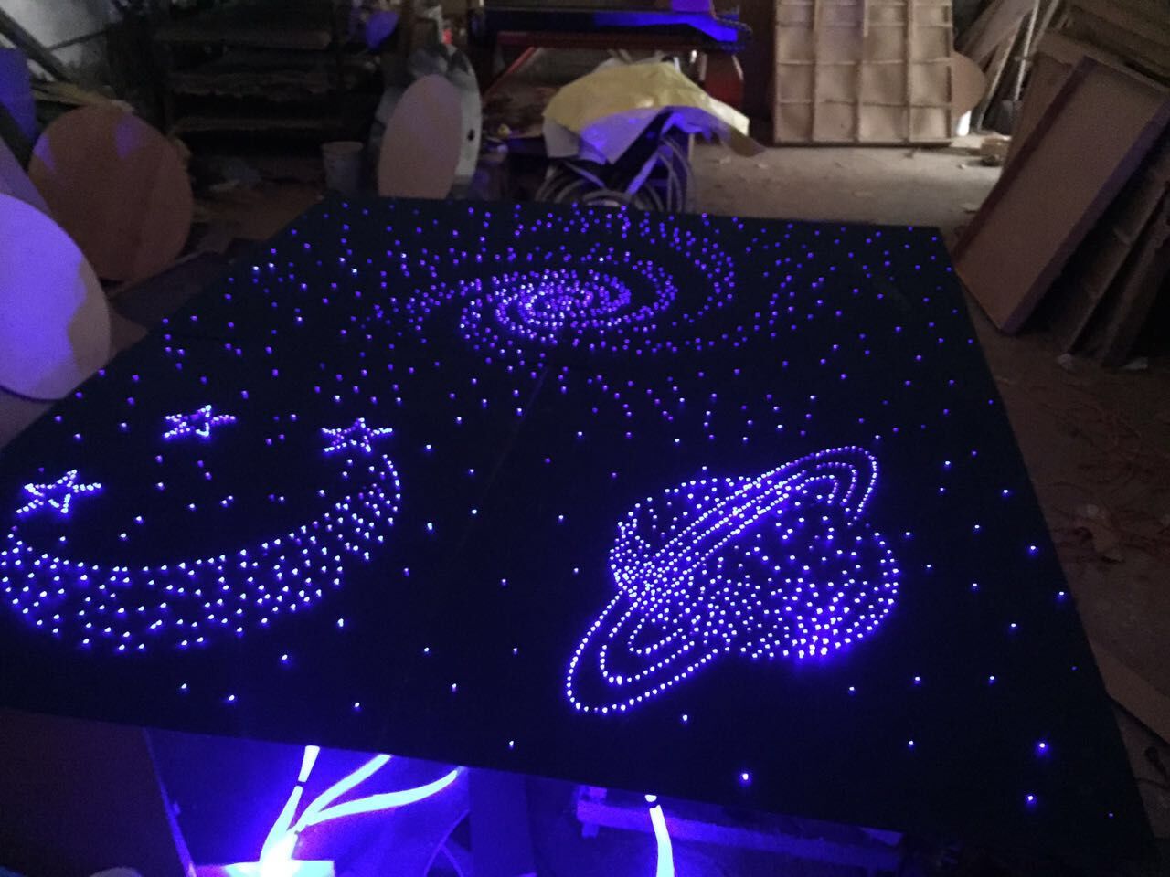 用光纤装饰吊顶的设计可以设计为光纤满天星,包括十二星座图,可以设计为顶面图案,这里所说的图案主要是指用光纤端光点组成线,再由线组成图案。