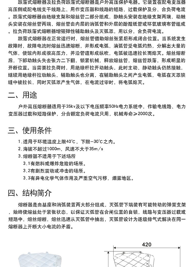 跌落式熔断器及拉负荷跌落式熔断器是户外高压保护电器。它装置在配电变压器高压侧或配电线支干线路上,用作变压器和线路的短路、过载保护及分、合负荷电流。