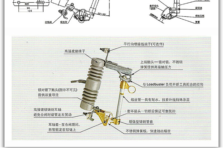 跌落式熔断器及拉负荷跌落式熔断器是户外高压保护电器。它装置在配电变压器高压侧或配电线支干线路上,用作变压器和线路的短路、过载保护及分、合负荷电流。