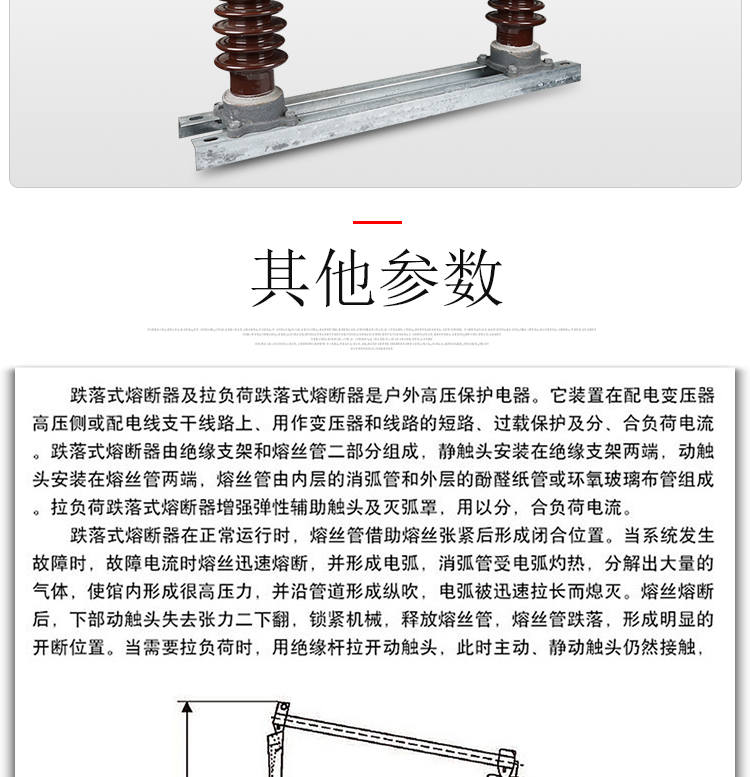 跌落式熔断器及拉负荷跌落式熔断器是户外高压保护电器。它装置在配电变压器高压侧或配电线支干线路上,用作变压器和线路的短路、过载保护及分、合负荷电流。