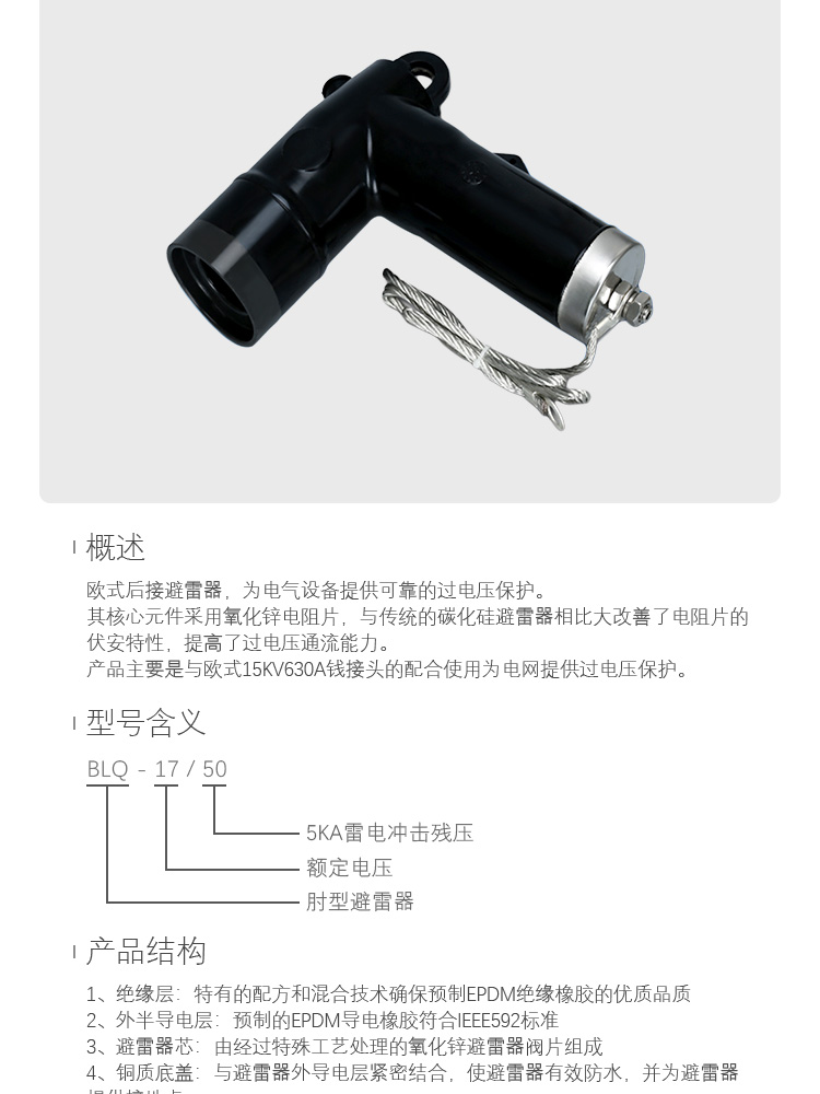 产品主要是与欧式15KV630A线接头的配合使用为电网提供过电压保护。