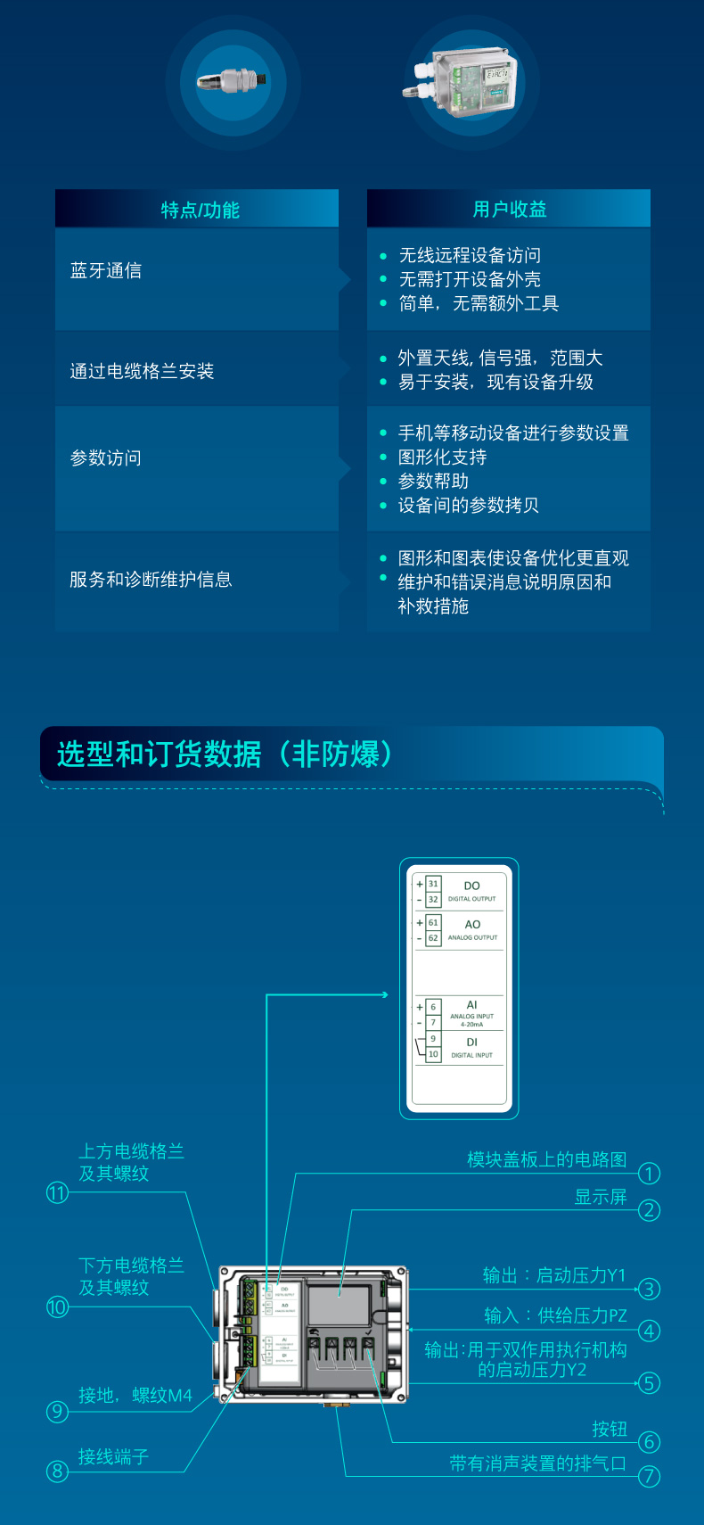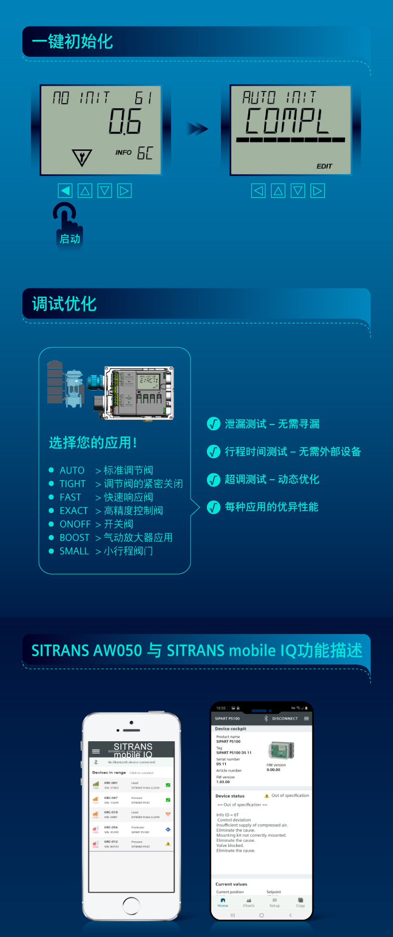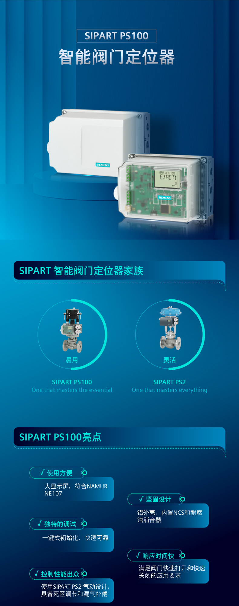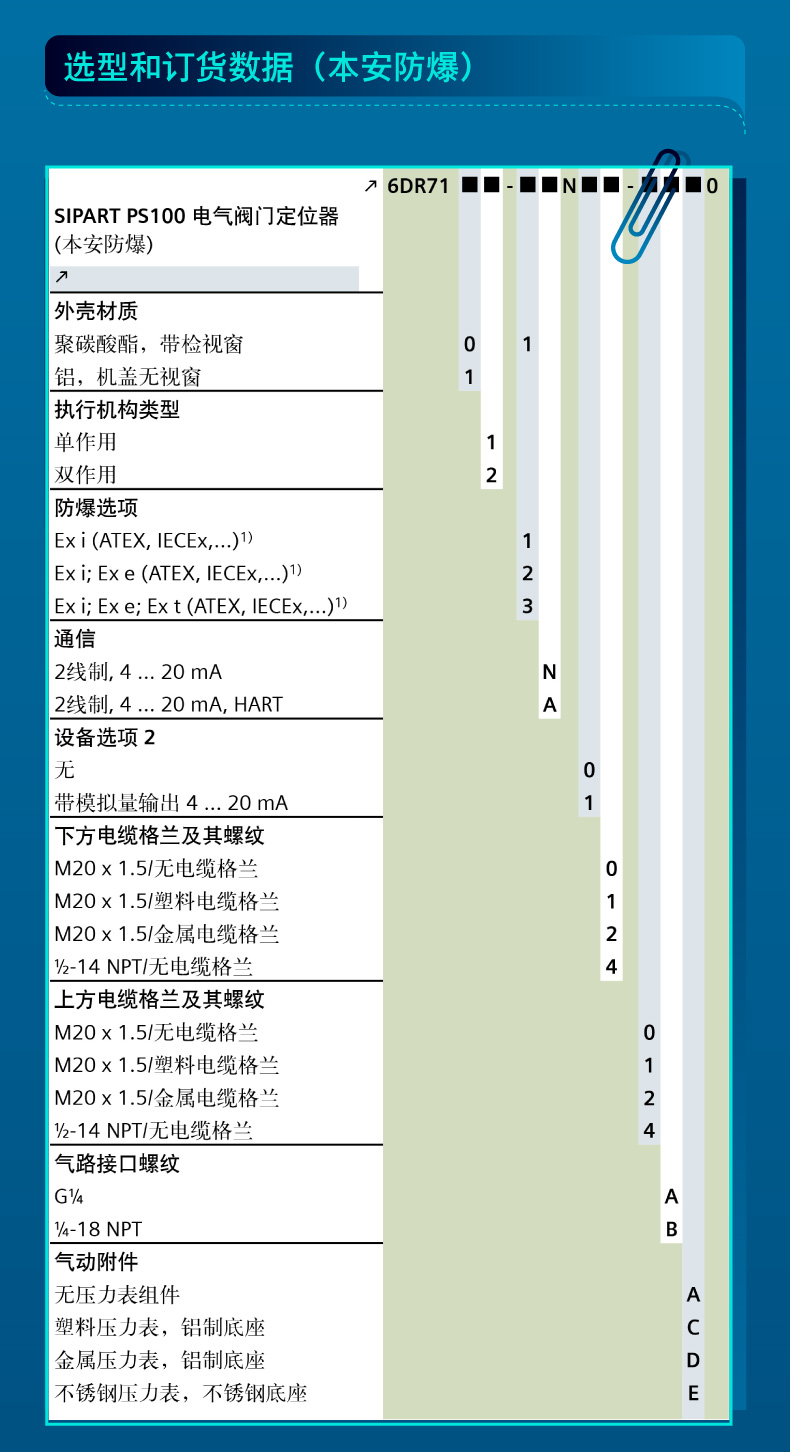 具有 4 至 20 mA 输入的 SIPART PS100 电动气动定位器可自动控制阀门。定位器外壳有一个没有观察窗的铝盖。它适用于单作用和双作用线性和部分回转执行器。不需要定位器知识。只需按一下按钮即可完成调试。双作用 Ex i (IS) 2 线,4 ... 20 mA,HART 不带设备选项 1 不带设备选项 2 下部电缆入口螺纹:M20 x 1.5 / 带电缆密封套塑料 上部电缆入口螺纹: M20x1.5 / 带气动螺纹堵头 1/4-18 NPT 无压力表块 无其他设计