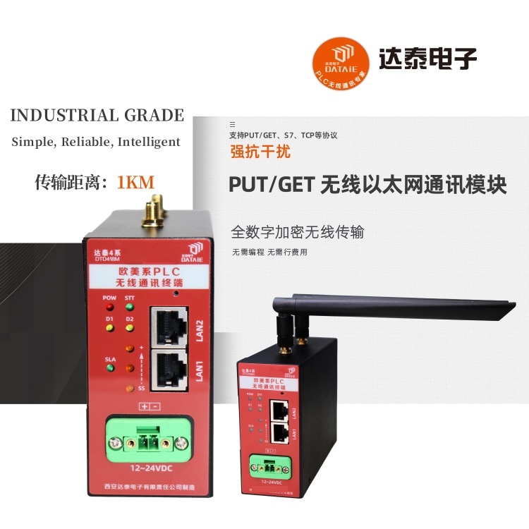 达泰DTD418M采用 2x2 两发两收无线架构,空中传输速率高达 300Mbps,兼容西门子S7协议、Profinet协议、Modbus TCP/IP等通讯协议,并采用 OFDM 调制及 MIMO 技术,使无线可靠传输距离达到1KM范围内均可使用。 DTD418M 不仅能与 PLC、DCS、智能仪表及传感器等设备组成无线测控系统,同时能与组态软件、 人机界面、触摸屏、测控终端等工控产品实现点对点和点对多点的远程无线组网,将分散不便于挖沟布线的设备连接在一起,不需要编写程序,不需要布线,并且稳定可靠。