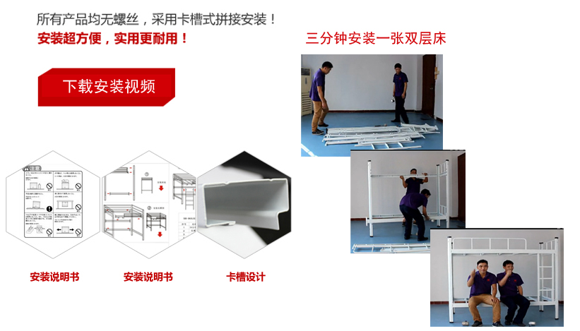 广东聚大智能家具有限公司是一宿舍床的研发设计生产为主的服务性公司。公司专利产品卡式连接结构宿舍床主要有:午托床、宿舍床,双层铁床、单层床,上下床,学生床,军用床桌床柜组合等宿舍床产品生产厂家。聚大宿舍床组装简单,无噪音,无异味,无需焊接。安装仅需3分钟,给您最专业安装的使用保证。您也可以自己轻松安装,从而节省安装成本。吸收国内外宿舍床生产先进技术和设计思想,