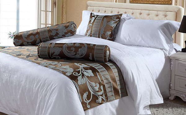 床尾巾(床尾垫)在一般都是用在酒店客房,但是一些家庭为了点缀自己房间的气氛,也有铺床尾巾。床尾巾是一种用在酒店或者家居客房床上的用品,床尾巾又命名为床尾垫,床旗等,南方常叫为床旗,中国北方者大都叫为床尾巾。布草属于酒店专业用语。是酒店客房部对客房放置的毛巾、台布和床单、枕套等的通称,酒店布草泛指现代酒店里差不多一切跟“布”有关的东西,包含床上用品如被褥被套、棉胎被芯,床单床罩、枕套枕芯、床笠床裙、床尾垫、保护垫,以及毛巾类制品如面巾、方巾、浴巾、地巾、浴袍等等,还包含台布餐巾、椅套台裙、浴帘等等。