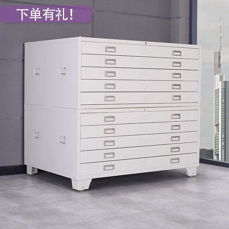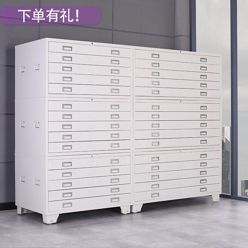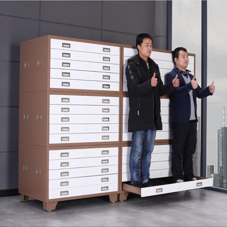 0.8-1.6mm点解片和不锈钢材料。垂直底图柜顶盖配以德国气动伸缩杆,底图柜底加特种滚珠路轨。顶及柜体前半部分均可以打开。该柜广泛用于储存大型AO图纸,存取、查找方便。四斗图柜和七斗图柜配有两个塑胶拉手,抽斗内配一压板用合页锁在抽面内部,用来压住图纸,在抽拉抽斗时不会弄乱图纸。产品优点: