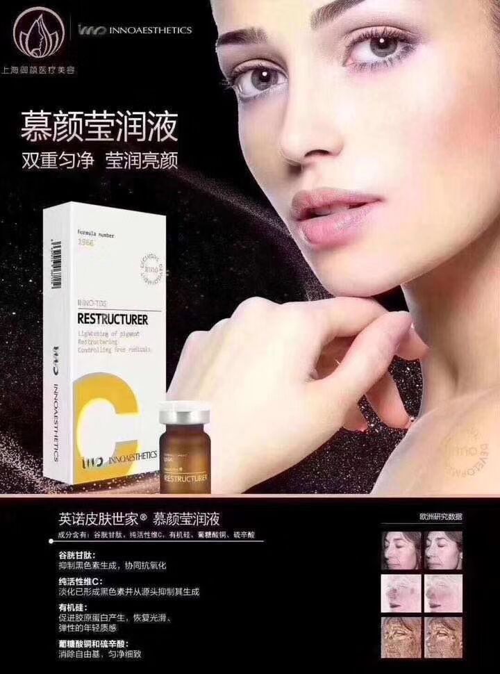 西班牙原装进口被称为“黄褐斑克星”从源头抑制黑色素生成逆转已形成黑色素并加速黑色素代谢双效去黑,强效淡化斑点。1.西班牙品牌,120年历史,4代药理学博士不懈研究,造就经典配方;2.全球65个国家使用,每年消耗300万瓶,每分钟消耗6瓶;3.去黑素专研色素问题,全途径管控黑色素,祛斑美白,均匀肤色;4.一次使用,7-10天快速起效,长期使用效果更好。5.五次一疗程,每瓶5mL两周一次,建议使用水光与微针导入中胚胚层疗法。6.适用肌肤:黑眼圈,暗沉,斑点,痘印,黄褐斑,哂斑以及光电返黑引起的皮肤症状7.独特的微水科技20L水仅提取1L的微水用于产品的生产以优异的水载体将成分导入肌肤。8.市场推广价19800元一个疗程/5次英诺小棕瓶成分配比:谷胱甘肽:抑制黑色素生成协同抗氧化纯活性维C:淡化已形成黑色素并从源头抑制其生成葡糖酸铜和硫辛酸:消除自由基,匀净细致有机硅:促进胶原蛋白产生,恢复光滑弹性的年轻质感医学:1.黄褐斑适合于活动性斑,如激光越打颜色越深的斑,近半年加重的班,明显的块状片状斑,底层有炎症的斑;定性斑(太田痣,老年斑,雀斑)、母斑效果不如激光,如有内分泌或代谢性基础疾病,则效果不会太好,2.炎性色沉效果很好,一次改善60%左右,使用英诺小棕瓶2-3次炎性色沉可消退,炎性色沉包括:激光等美容术后返黑,受伤后色沉,痘印,晒后变黑3.英诺小棕瓶注射方法更新:2.5ml水光,深度1.2mm最佳,若疼痛,可以打1.0mm,德玛莎调节单针剂量为0.0179;2.5ml滚针,0.5mm深度,边滚边涂抹,不要见血,斑位水光和滚针多覆盖几遍! 关于如何减少去黑素打水光漏液的问题,水光仪器调整的参考参数如下:单针剂量 0.0179-0.0205;后退值调到0,就是不需要后退;如果可以耐受,水光深度优先1.2,深一点不容易漏液。