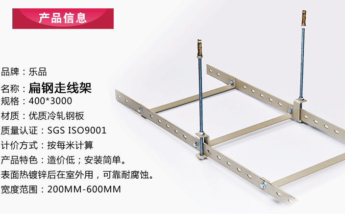扁钢走线架是较早在国内使用的产品。它有造价低;安装简单的特点。主材选用优质扁钢,表面喷塑或热镀锌(室外用)。