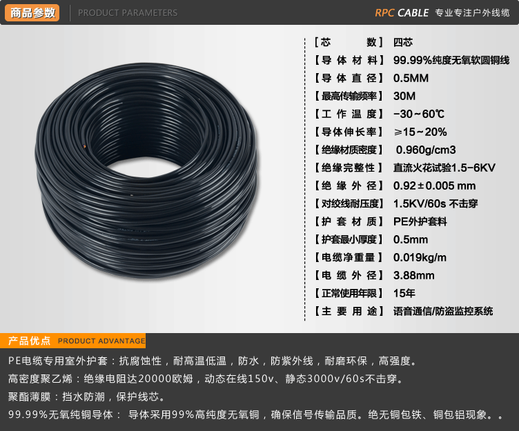 广东达强品牌 室外电话线 纯铜4芯电话线 4芯0.5全铜 黑