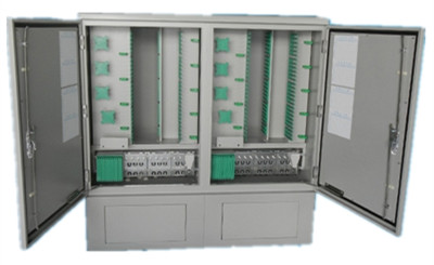 2.容量:72芯96芯144芯288芯360芯432芯576芯720芯864芯1152芯几种。箱体材质常见的为SMC 箱体。(SMC 是Sheetmolding Compound 的缩写,即片状模塑料。主要原料由SMC 专用纱、不饱和树脂、低收缩添加剂,填料及各种助剂组成。SMC 具有优越的电气性能,耐腐蚀性能,质轻及工程设计容易、灵活等优点,其机械性能可以与部分金属材料相媲美,因而广泛应用于运输车辆、建筑、电子/电气等行业中。