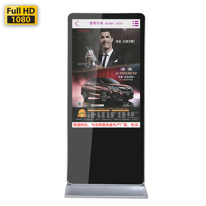产品特点:采用优质钢材,冷轧板后盖+型材边框+前钢化玻璃面,防暴指数高; 6cm超薄机身,1080p全视角高清液晶屏,显示清晰细腻; 工业级液晶屏,全天候播放无压力;