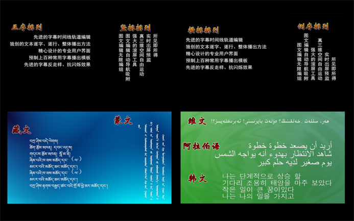 ◆文本支持各种对齐方式,横排、竖排、正序、倒序排列 ◆支持少数民族语言字幕 ◆支持文本逐字属性编辑 ◆文本可以任意曲线变形、任意曲线摆放 |