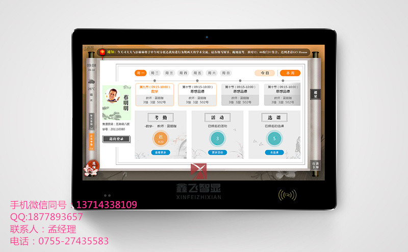 为每个教室配置一个前端显示触摸屏,安装在教室门口,用来显示班级信息,当前课程信息,教室环境信息以及学校的通知信息,为学生和老师提供了便利。