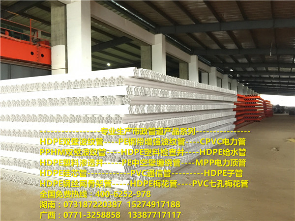 产品系列关键字:HDPE双壁波纹管,HDPE钢带增强螺旋波纹管,HDPE中空壁缠绕管,HDPE给水管,PVC通信管,多孔梅花管,CPVC高压电力套管,塑钢缠绕管排水管,HDPE子管