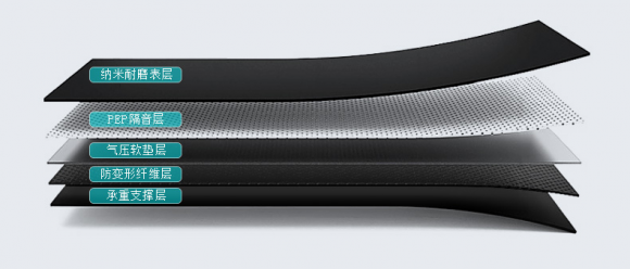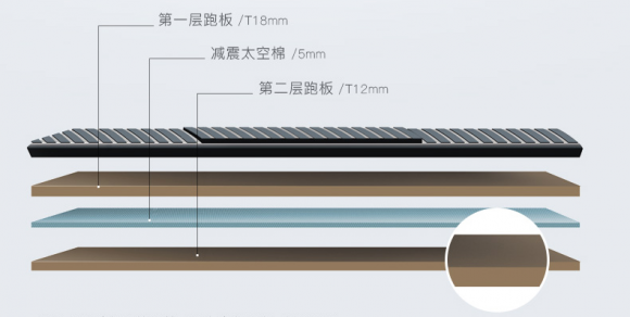 复健式双层加密跑板采用t18+t12跑板两块叠并,加大跑台厚度,加强承重,多层护足结构,舒适稳定回弹,消音缓震。