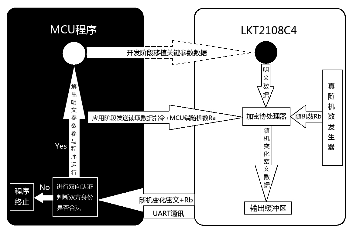 LKT2108C4 FPGA/DSP专用保护加密芯片(以下简称LKT2108C4)内部嵌入凌科芯安公司的LKCOS智能操作系统,支持UART和7816智能卡通讯接口。LKT2108C4内部固化超高安全加密算法,如图-1所示,用户只需按标准流程将MCU中的重要数据参数移植到LKT2108C4中,即可在使用过程中,实现双向身份认证与随机读取密文数据参数的功能。在实际运行过程中,MCU发送指令将移植的参数以随机密文方式读回,认证并解密后还原出重要数据参数,应用到程序的下一步运行中。因此LKT2108C4成了产品的一部分,而重要参数在LKT2108C4中存储和读回的过程中都是安全的,盗版商无法破解,从根本上杜绝了程序被破解的可能。