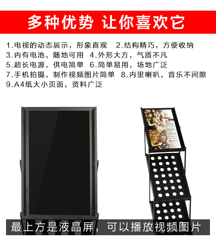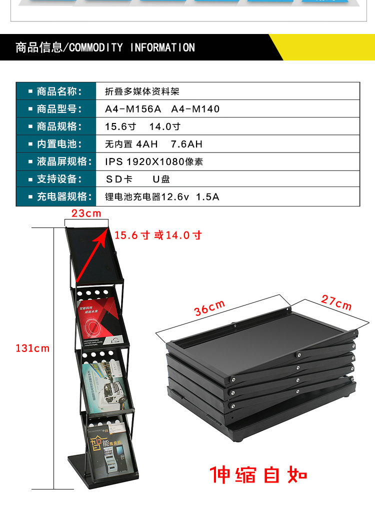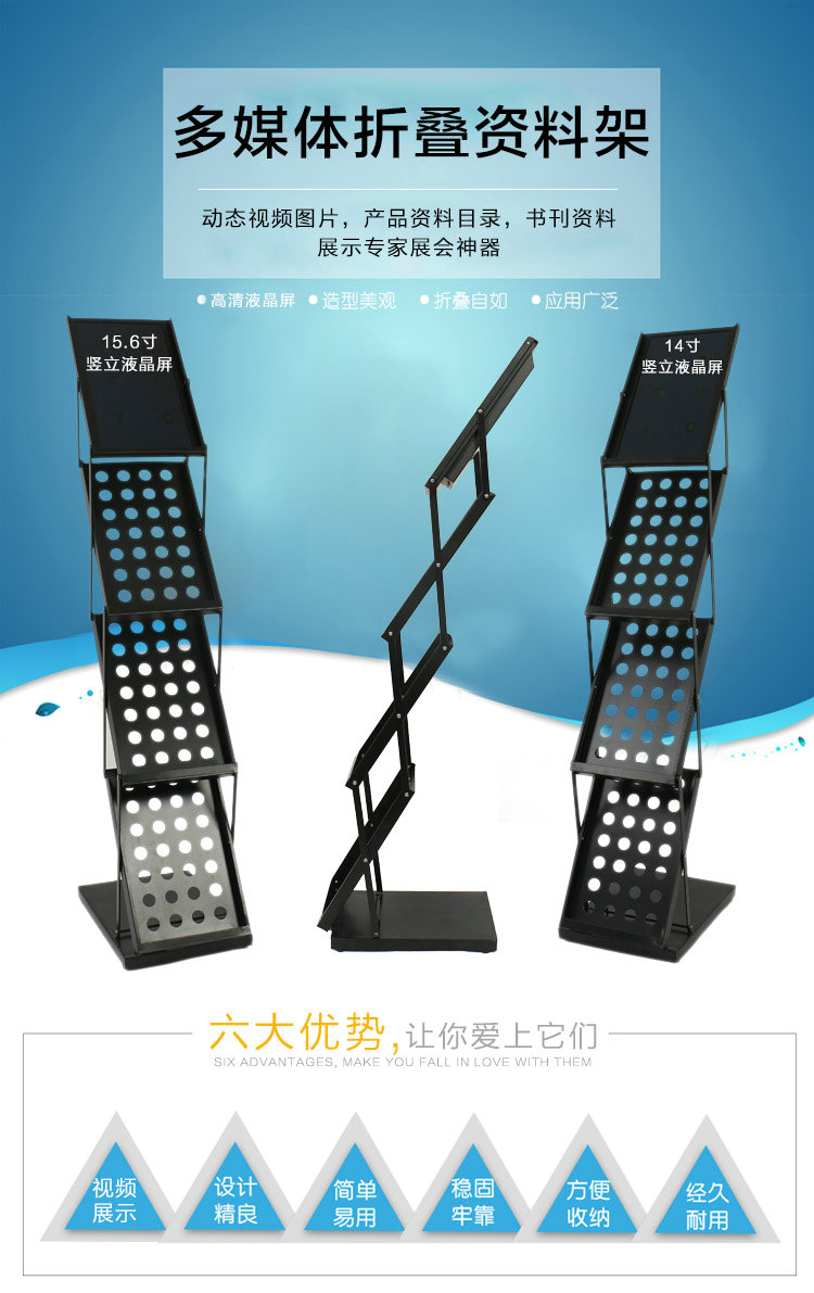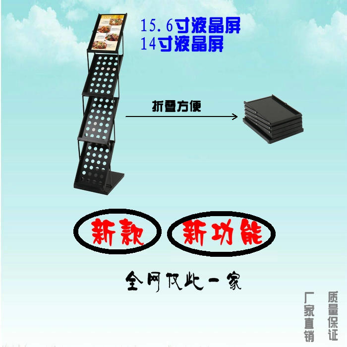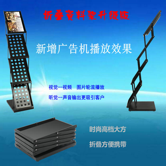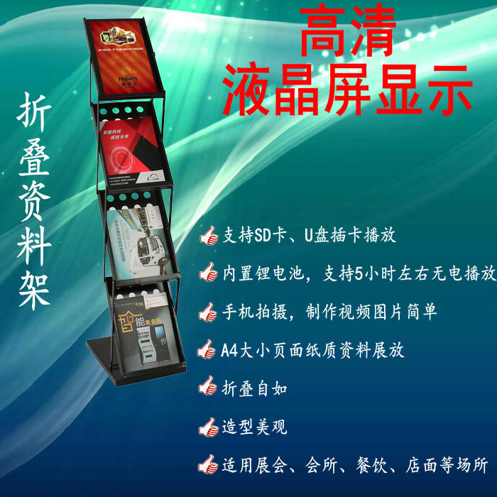 本款产品是集成15.6寸(14.0寸)高清液晶屏的折叠资料架,动态展示图片视频广告,静态展示A4幅面的资料目录。采用1920X1080 IPS液晶显示屏,支持高清视频,图片,MP3播放。选配内置锂电池。可以方便展开使用及折叠收纳。