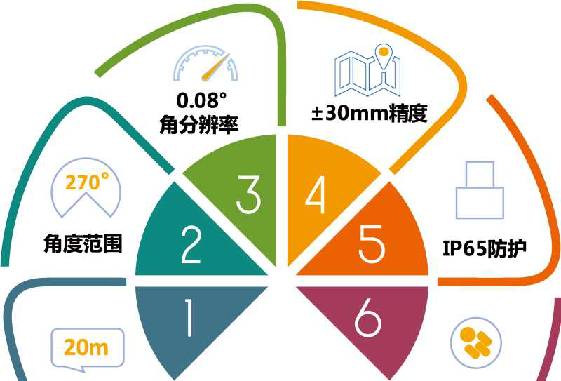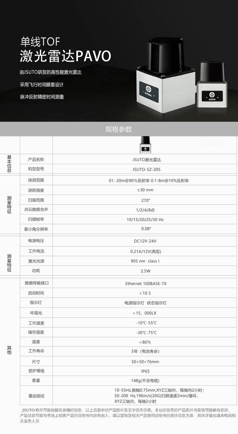 JSUTOPAVO可实现20 m范围内的可靠测量, 角度范围270。。得益于TOF方案优势和JSUTO 特有的高性能时间测量技术,PAVO表现出远 高于三角法雷达的测距性能,即便是对20 m处的 白板测量,也可获得土 30 mm的测距精度。 提供业内顶尖的0 08。*小角分辨率,实现对周围 环境的精细还原。用户可以通过配置改变电机转速 从而使输出的点云图像帧率在10-30 Hz范围内调节。