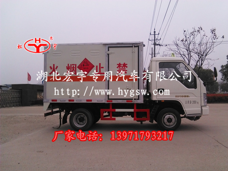 厢体顶部封闭,不可开启。ABS系统型号:CM4YL,厂家:广州市科密汽车制动技术开发有限公司; 运输介质:黑火药,压缩黑火药,电引爆雷管,爆破炸药,点燃导火索,专用烟火制品等.运输介质类别和项别号:1.1D,1.1D,1.1B,1.1D,1.4G,1.1G等;装配限速装置,限制最高车速不得超过80km/h,安装具有卫星定位功能的行驶记录仪,只装配底盘子午胎,排气管前置.采用底盘前轮盘式制动器;随底盘选装驾驶室,选装车厢侧面无门结构,选装后门结构。 |