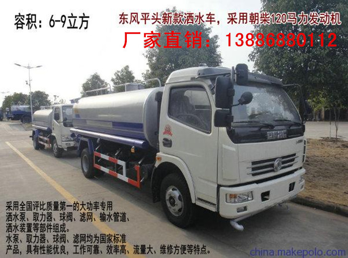 东风多利卡洒水车:罐体容积; 6-8吨;发动机:朝柴120马力、康明斯140马力、轴距:3800;轮胎:7.50-16。单排驾驶室(可翻转)