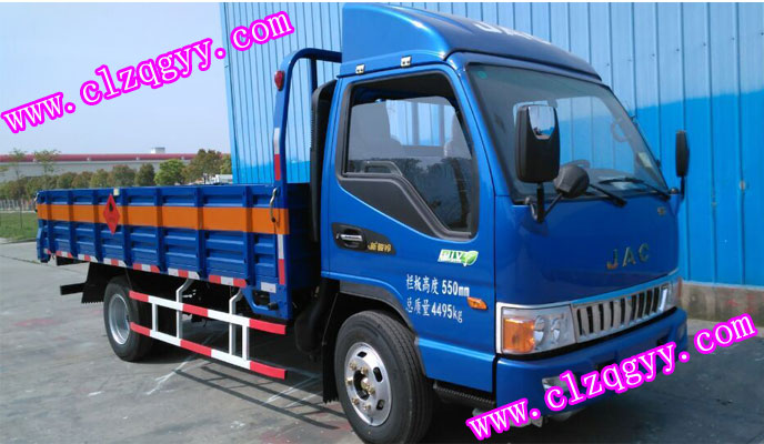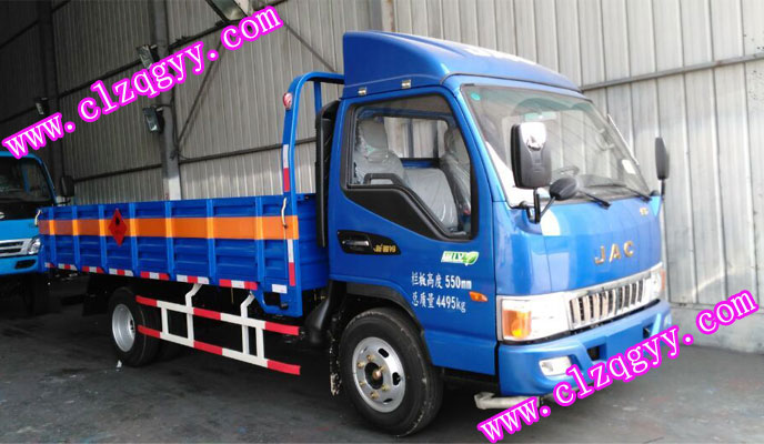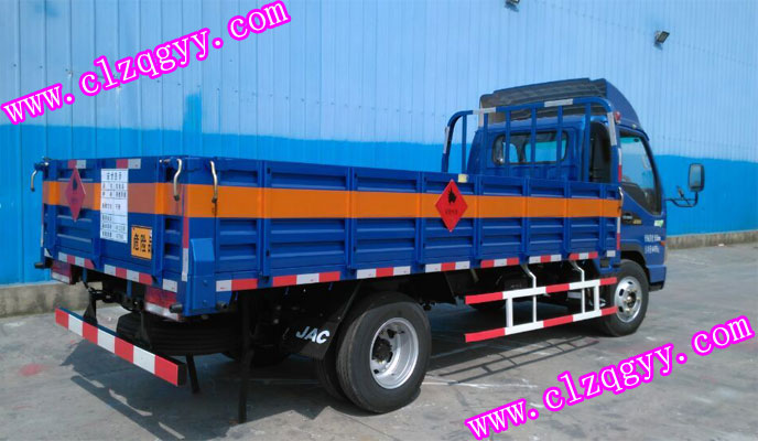 气瓶运输车产品配置: 气瓶运输车采用 江淮新骏铃单排前翻驾驶室,带空调带方向助力,采用江淮120马力发动机,5档变速箱,7.00R16钢丝胎,气刹。