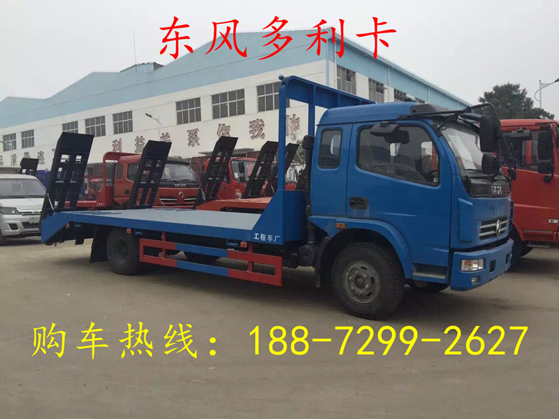 东风多利卡平板运输车(黄牌)可拉10吨以下不可拆卸的工程机械运输车,挖掘机,装载机,收割机等。如需详细参数价格可拨打电话:188-7299-2627咨询。