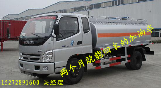 东风福瑞卡5吨油罐车,加油车:底盘采用东风福瑞卡,气刹,单排可前翻驾驶室,轴距3300,188mm直通车架,前桥2吨,后桥4吨,5档变速箱,700-16尼龙胎,带方向助力,锡柴95马力发国Ⅲ排放发动机;油罐车罐体容积4立方-6立方米,罐体采用4mm厚碳钢板制作,带齿轮油泵,可泵进泵出,可选配车载式电脑加油机:选装15米加油管,带加油枪,可按升、按金额计量加油。另可选装流量表。加油机可装在油罐车罐体前部仓内或装于车体侧下部,是一款可以流动加油的加油车.