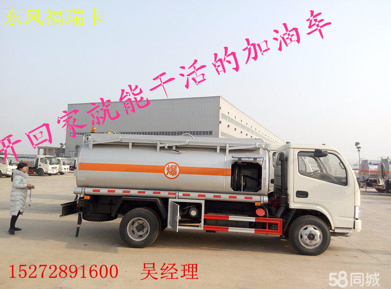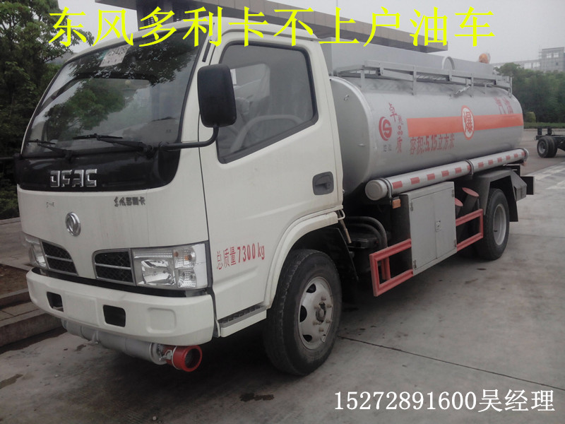 东风多利卡5吨油罐车:底盘由东风公司产,朝柴120马力国四柴油发动机,轴距3300mm,带动力转向,前桥2吨,后桥4吨,700-16尼龙胎,东风油罐车罐体容积5立方-8立方米,罐体采用4mm厚碳钢板制作,带齿轮油泵,可泵进泵出,可选配车载式电脑加油机:三金牌加油机、恒山牌加油机、伯莱牌加油机、正星牌加油机。选装15米加油管,带加油枪,可按升、按金额计量加油。另可选装流量表。加油机可装在油罐车罐体前部仓内或装于车体侧下部,带随车工具,两个灭火器,其与为厂家标配。