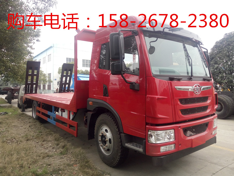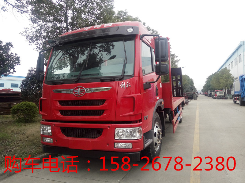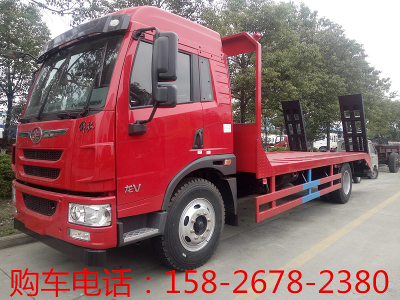 解放龙V国五平板拖车配置:上户吨位9吨,最大承载15吨。大柴道180马力增压,陕齿8档变速箱,4T前桥,9T后桥,5000轴距,9.00-20钢丝胎,232双层大梁。整车尺寸9x2.5x2.8/。燃油、环保公告齐全