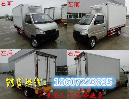 长安小型冷藏车,货箱尺寸:2550×1410×1490,69马力发动机,165R13LT真空胎。 厢体采用粘接式结构,接触面积大,力分布均匀,密封性好,整体结构强度高,箱体内饰彩钢板,外饰玻璃钢,箱体具有保温性能好、环保节能,外形平整美观、经久耐用、保温性能达到国标A级,稳固性和气密性是普通冷藏厢体不可比的,并且具有质量轻 抗冲击力强,无渗漏等优点,使用寿命长(是普通冷藏车厢的2倍以上)。通过优化设计降低了整车质心,增大了有效容积。